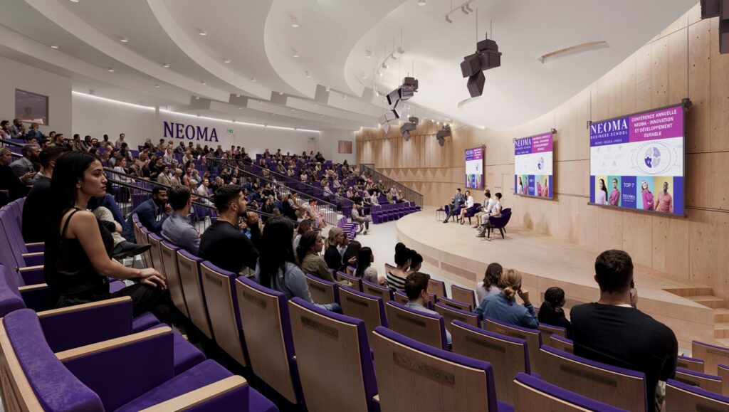 « Il s’agit d’un campus que nous construisons pour 30 ans, projette Delphine Manceau. Un campus ouvert, qui doit respecter les besoins de flexibilité de nos étudiants et apprenants. Les espaces doivent pouvoir s’adapter facilement aux nouveaux usages », estime la directrice générale de NEOMA qui garde le suspense concernant l’aménagement de quelques salles dites « innovantes ». D’autres son plutôt pensées comme des espaces de « créativité », des salles « immersives » seront également aménagées, de même que des salles de captation ainsi que 70 salles plus classiques (de 105 ou 126 m2), toutes ouvertes sur l’extérieur pour bénéficier d’un maximum de lumière naturelle, équipées de la même manière et pouvant accueillir de 30 à 60 étudiants. Autres espaces incontournables pour tout établissement d’enseignement supérieur (outre le fameux couloir des associations qui se trouvera dans le prolongement de « La Ruche ») : les amphithéâtres. Ils sont au nombre de deux, pouvant chacun accueillir 120 étudiants.