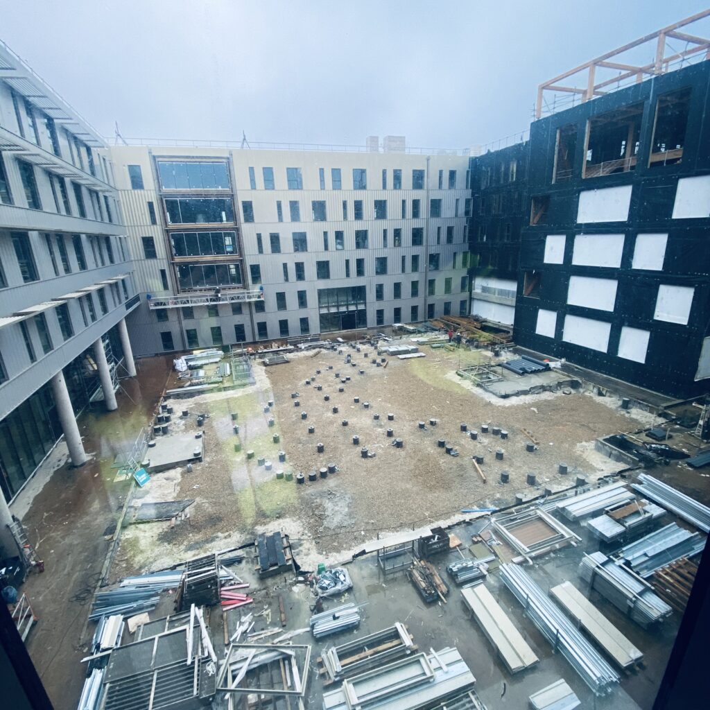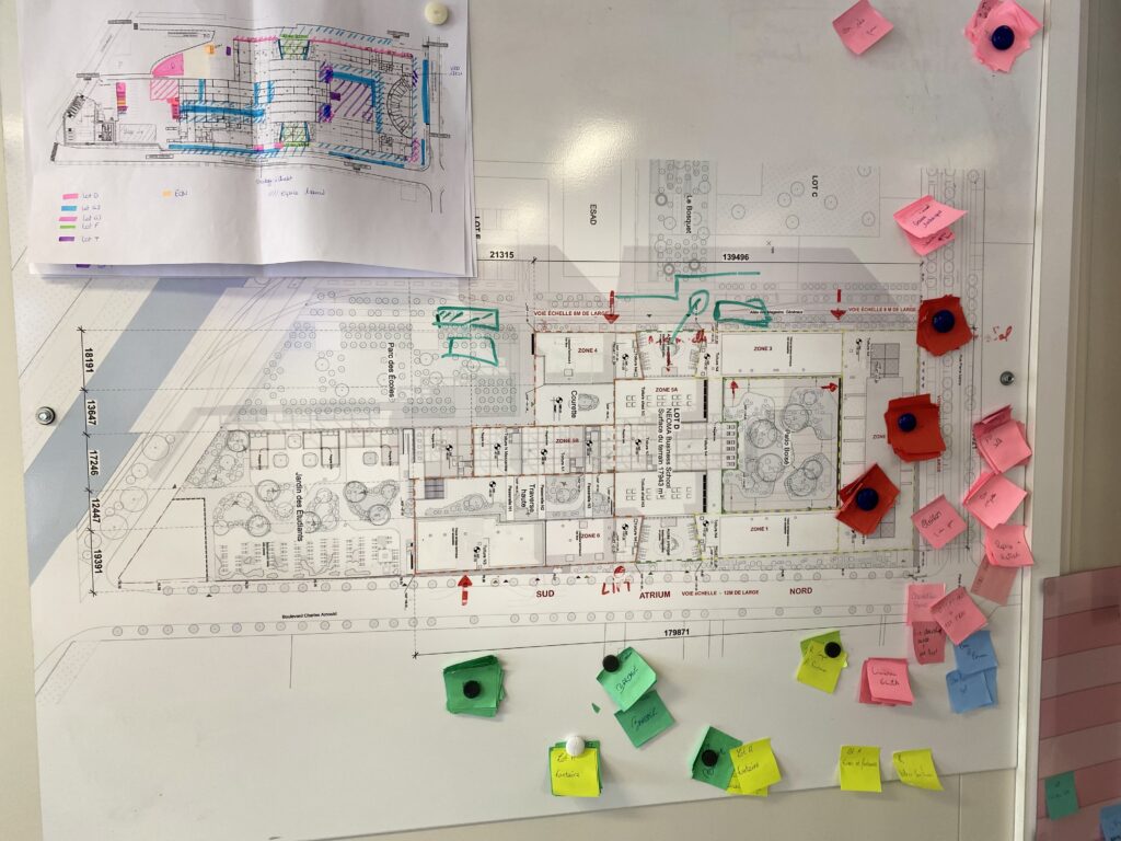 Les travaux devraient s’achever durant l’été 2026 et NEOMA projette une ouverture du campus en janvier 2027. Six années au total se seront écoulées entre le projet initial et la livraison finale. Une durée « classique » pour un ouvrage de cette ampleur, situe Sébastien Baillet en début de visite, alors que nous laissons nos yeux trainer sur les murs couverts de plannings impressionnants… La business school pourra accueillir sur place jusqu’à 6 200 personnes qui circuleront dans des espaces desservis par « La Ruche ». Immense structure en bois allant jusqu’à 21m de hauteur, elle traversera tout le site jusqu’à déboucher sur les 1 600m2 de parc où les étudiants pourront déambuler librement, dans un esprit de « balade ».
